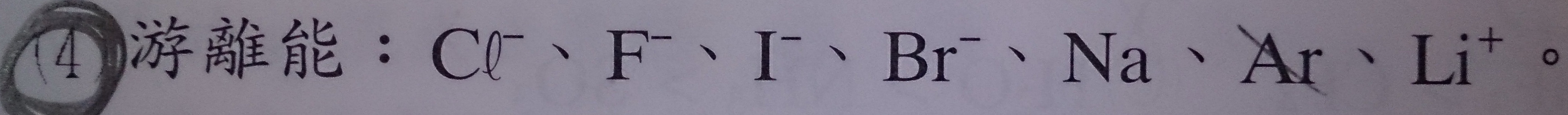 答: Li+ >Ar >Na >Cl- >F- >Br- >I-