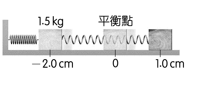 質量為 1.5 kg 的木塊與彈性常數為 1.0×103 N∕m 的彈簧連接在一起,另一端固定,置於光滑水平面上,當彈簧被壓縮 2.0 cm 後,木塊自該處靜止釋放,如圖所示。求木塊通過平衡點到達彈簧伸展 1.0 cm 處: