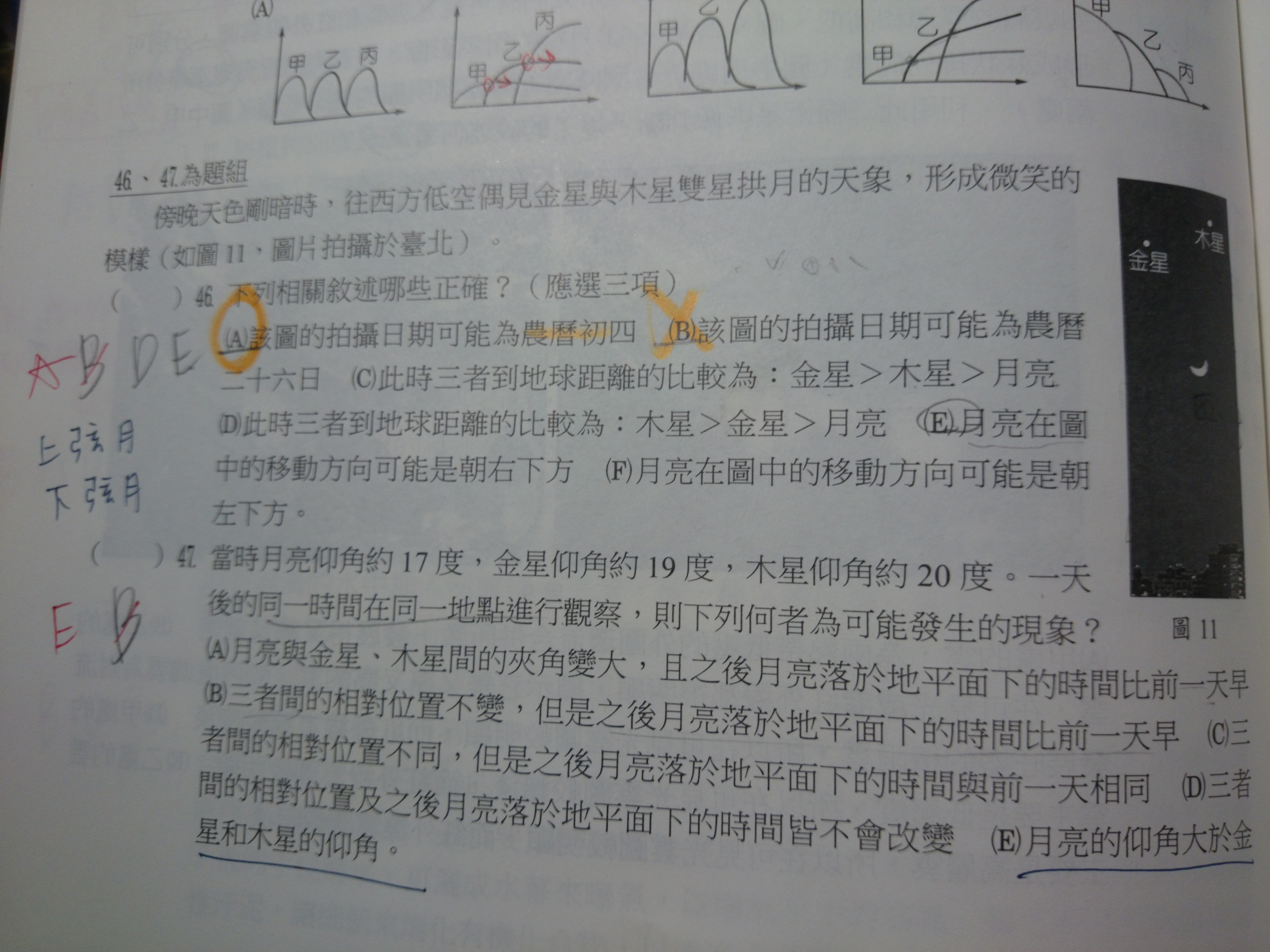 46題 這張圖要怎麼看出月亮是上弦月還是下弦月?