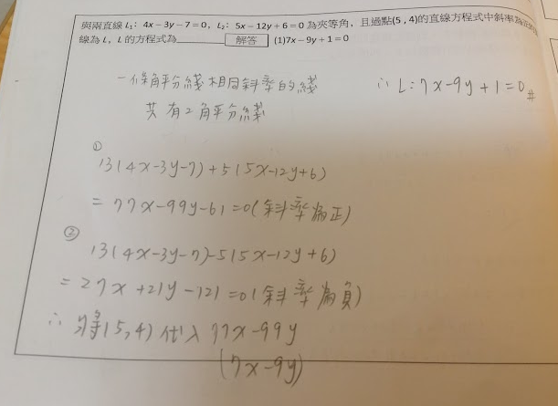 與兩直線L1:4x-3y-7=0 L2: 5x-12y+6=0 為夾等角,且過點(5,4)的直線方程式中斜率為正的直線為L,L的方程式為L L的方程式為?