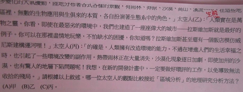 「從太空看地球」,以下是三位太空人在太空梭中的對話,請從它們的談話中,判斷它們各自從何種地理觀點,來探討地表現象。太空人(甲):「在浩瀚的星空中,地球真是最美麗的藍色星球。廣大的海洋,多變化的大一擾動,陸地分布著各式各樣的景觀,有雨林、莽原...。在這些地區裡