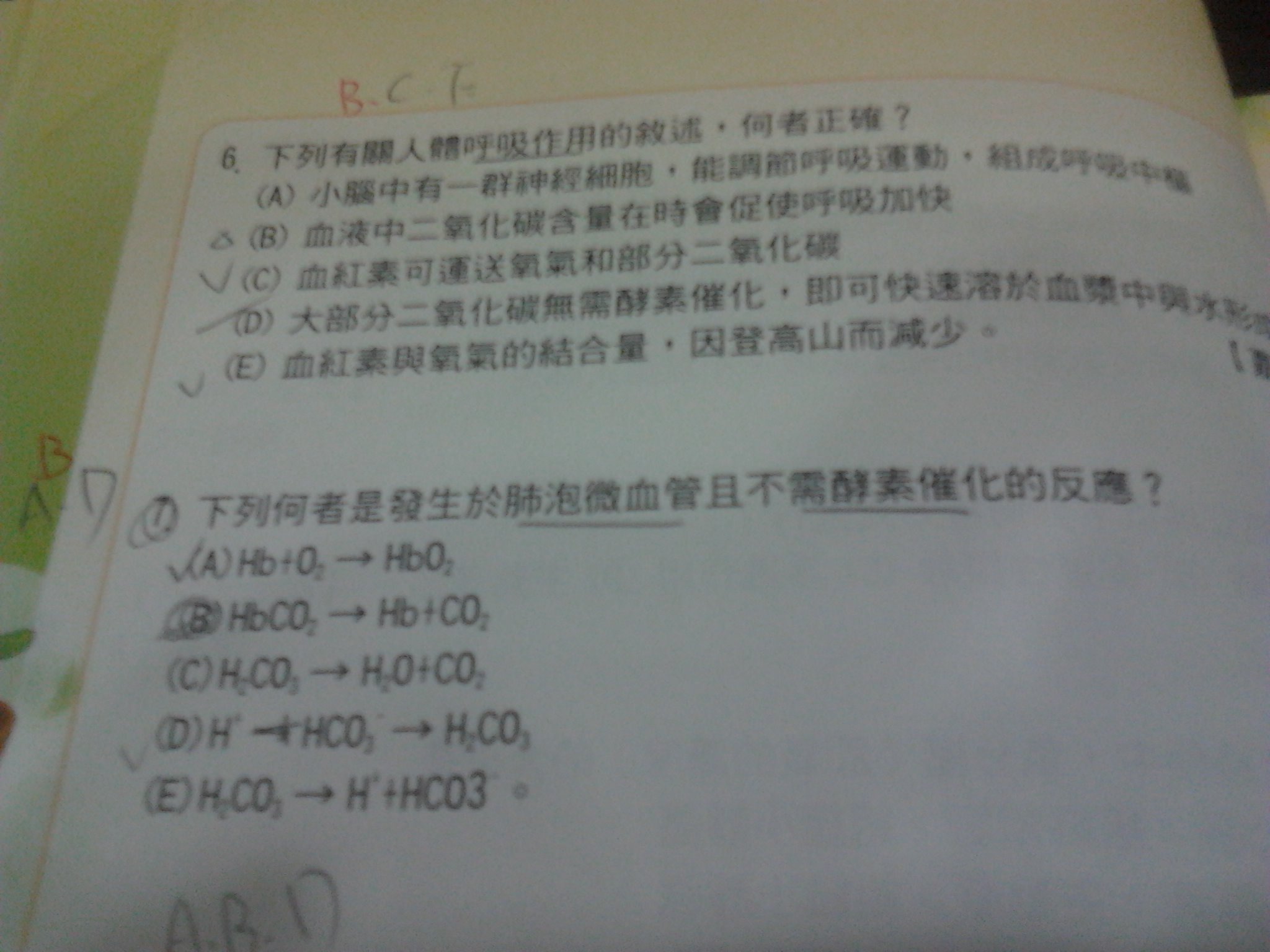請問D選項和E選項是可逆的關係,但D是發生在肺泡微血管且不需酵素催化,而E卻不是肺泡微血管?