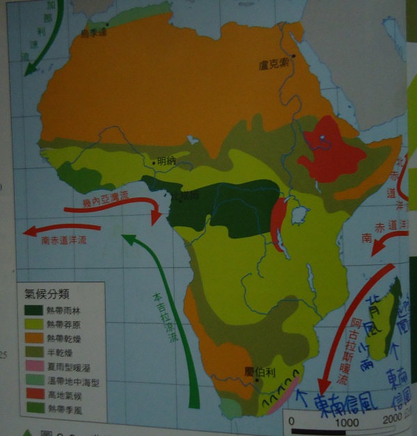 課本上的圖藍尼羅河經過高地/半乾燥/熱帶乾燥氣候,