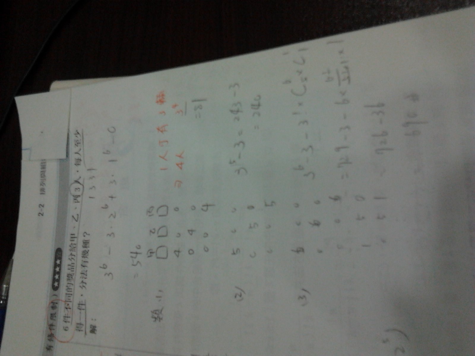 那這題呢?6件分3人,且每人皆有,鈉不應該是1人有6種選擇,6的三次方嗎?