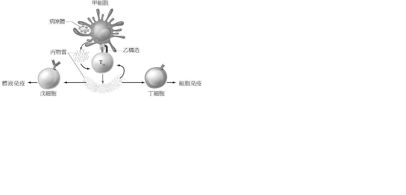 (1)甲細胞可能為何種細胞? (A)肥大細胞 (B)巨噬細胞 (C)樹突細胞 (D)癌細胞 (E)受感染的細胞。