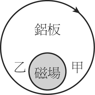 當一塊鋁板順時針轉動時,若其中有一部分會通過均勻磁場,磁場方向指入紙面,如圖所示,下列有關鋁板敘述何者正確? (A)鋁板甲區產生順時針方向應電流 (B)鋁板乙區產生順時針方向應電流 (C)鋁板上因產生應電流而有逆時針方向之磁力矩 (D)鋁板受力矩作用,而逐漸加速轉動