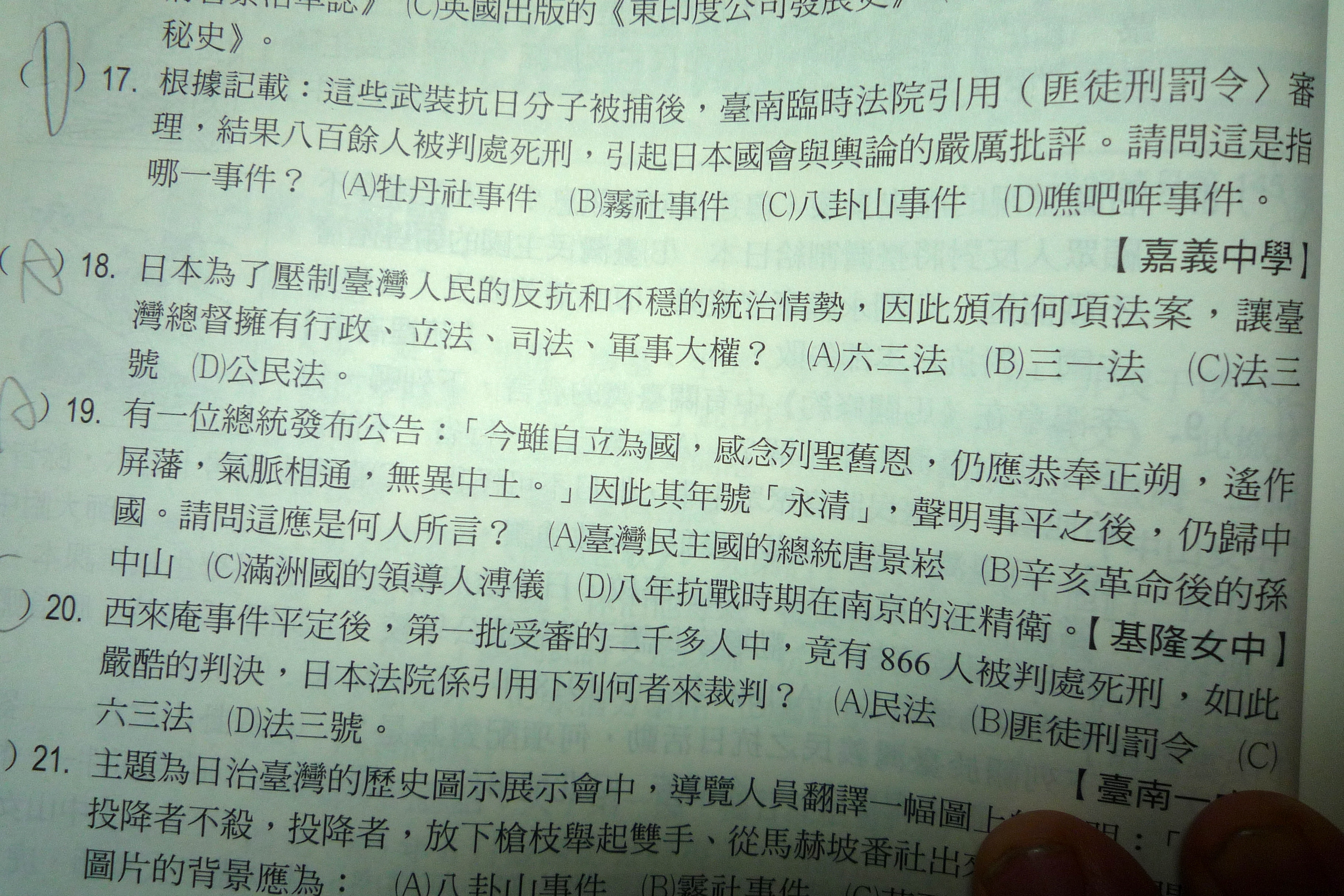 第17題和第20題怎麼感覺有點矛盾,都是指西來奄事件但為甚麼17題說是匪徒刑罰令旦20題卻說是六三法?