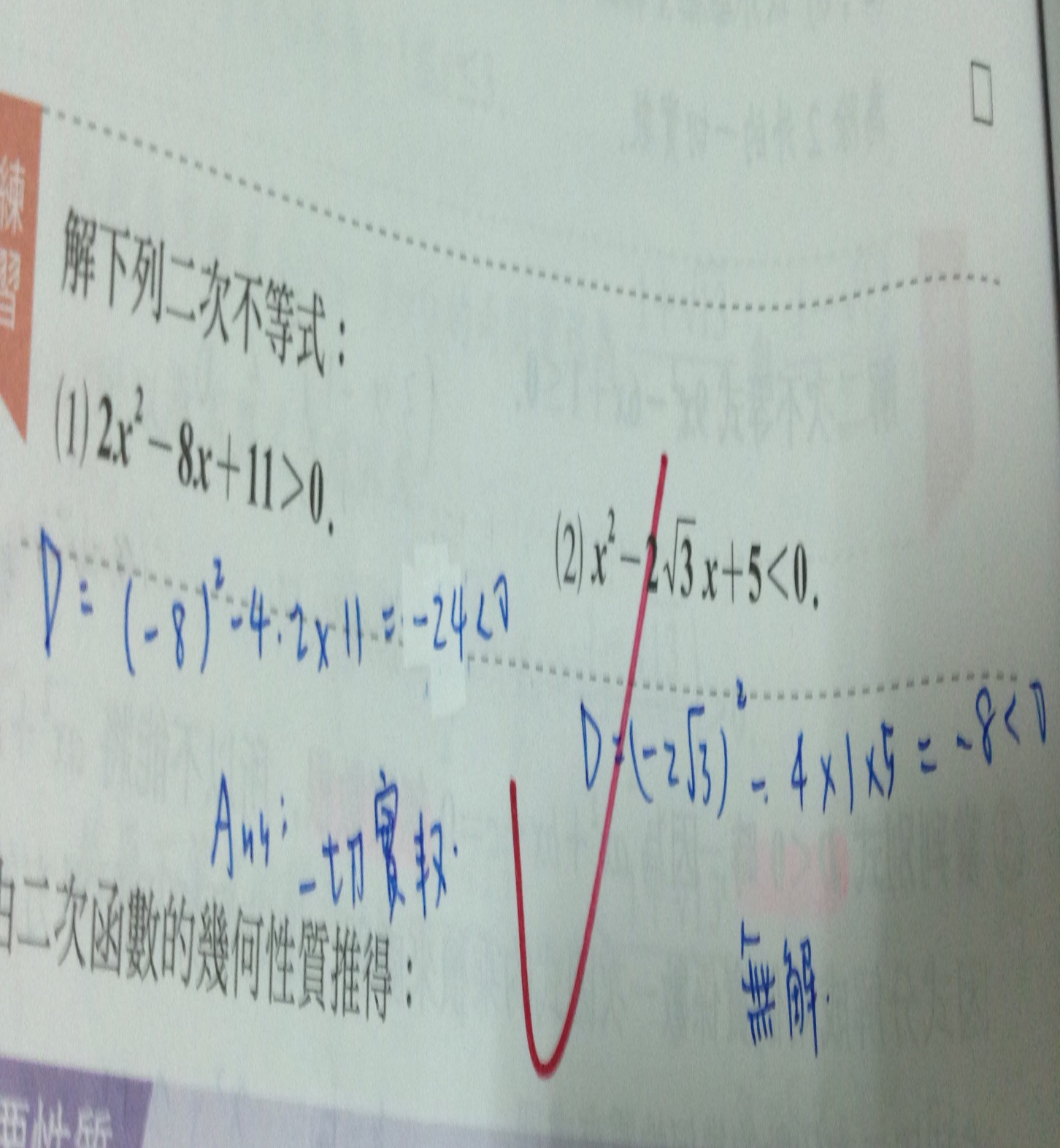 用判別式D小於0的算式解這兩題,要怎麼知道是一切實數或無解