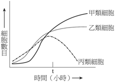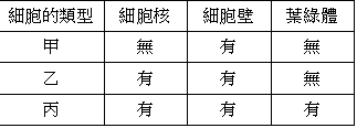 1.在生物實驗課中,老師拿出三種不同類型的細胞,讓學生分類。學生先在顯微鏡下觀察細胞的型態,結果整理於下表。再將三種細胞分別培養於富含氧氣與養分的培養基中,記錄三類細胞的數目於下圖,並於時間t後不再提供氧氣給細胞。試根據圖表文回答第(1)~(3)題: