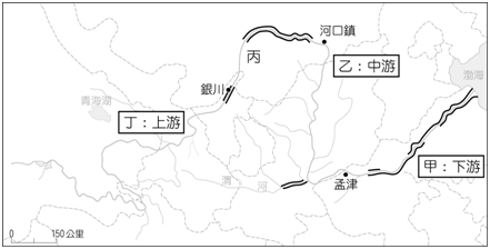 7.【題組題(1)-(3)】圖為黃河流域簡圖,甲:孟津→出海口;乙:河口→孟津;丙:銀川→河口(河套平原);丁:源頭→銀川。請問: