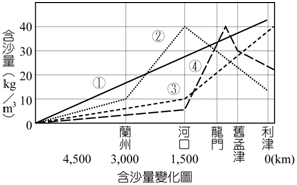( 選D )(2)請問在含沙量變化圖中,哪一條是黃河含沙量? (A)折線1 (B)折線2 (C)折線3 (D)折線4