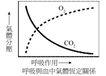 ( C對 )4.呼吸作用的主要功能是維持血中氣體含量的恆定,依氧與二氧化碳解離曲線,血液中氣體含量可以分壓表示。若呼吸作用的結果與血液中氧分壓和二氧化碳分壓變化的關係如附圖所示,縱軸向上箭頭表示氧分壓和二氧化碳分壓升高,而橫軸向右箭頭表示呼吸作用增加,下列敘述哪些正確?
