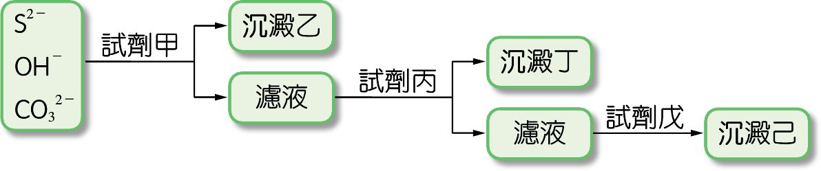 有一溶液中溶有 S2-、OH-、CO32-(皆為 0.1 M),欲使用硝酸鋇、硝酸銅、硝酸鎂(皆為 0.1 M)試劑,依下列流程順利分離離子,結果何者正確? (A)甲:Cu(NO3)2 (B)乙:CuCO3 (C)丙:Mg(NO3)2 (D)丁:Mg(OH)2 (E)己:CuS。答 (C)(D)(E)