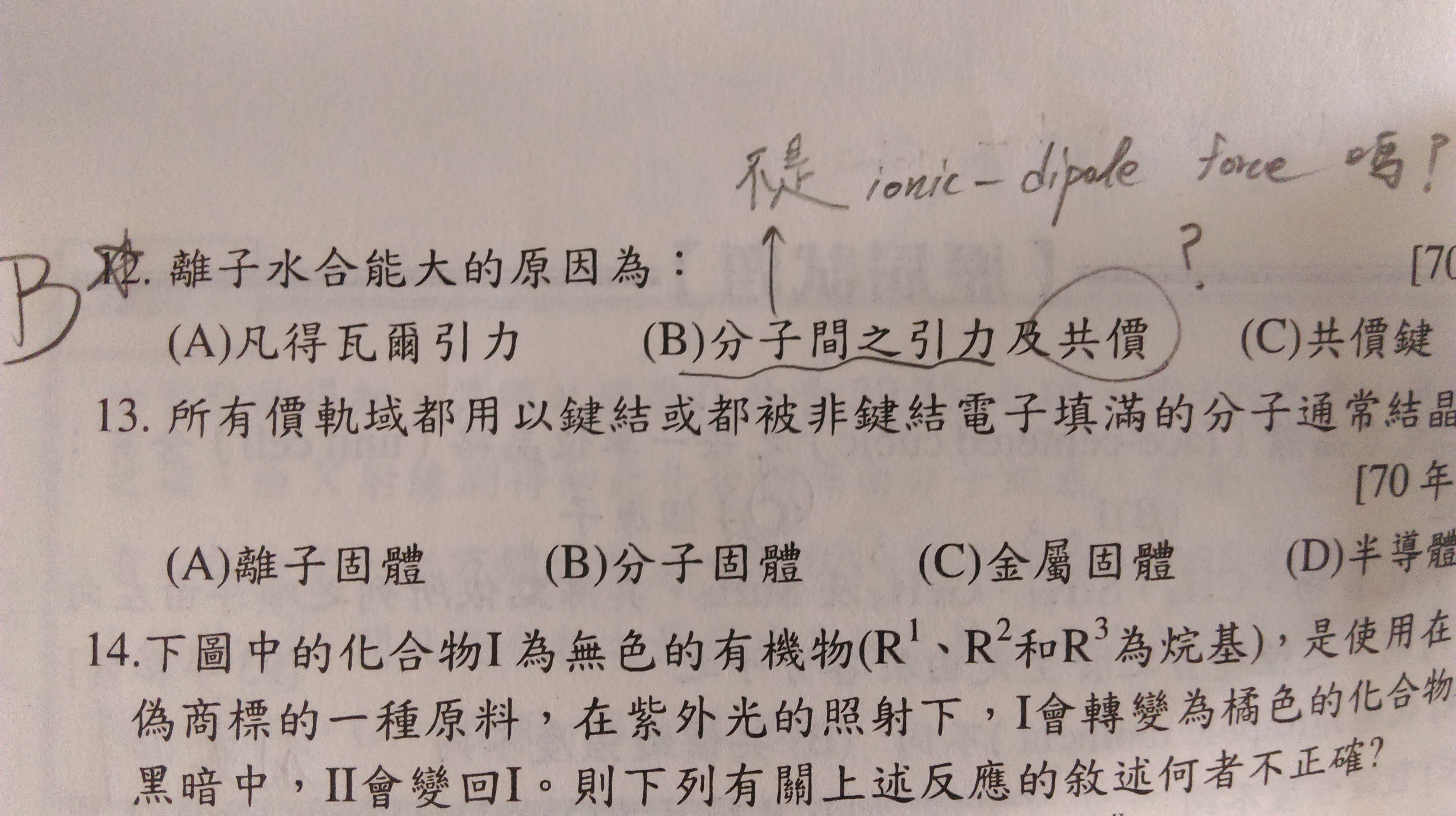 12題答案是B,可是水合能哪裡有共價鍵?????不是只有分子間引力嗎???應該只有ionic-dipole force