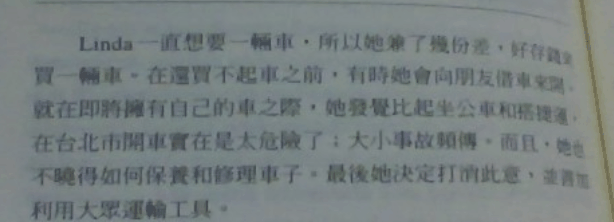 Linda had always wanted a car, so she took up several part-time jobs to save money to buy a car. Before she could buy a car, she lent a car from her friends to drive. As she was going to get her own car, she found that driving a car in Taipei was too dangerous in contrast with taking the MRT and taking bus; big and small accidents happens frequently. Moreever, she also didn't know her to maintain and repair cars. Finally she conceled tha idea and took advantage of public transportions.