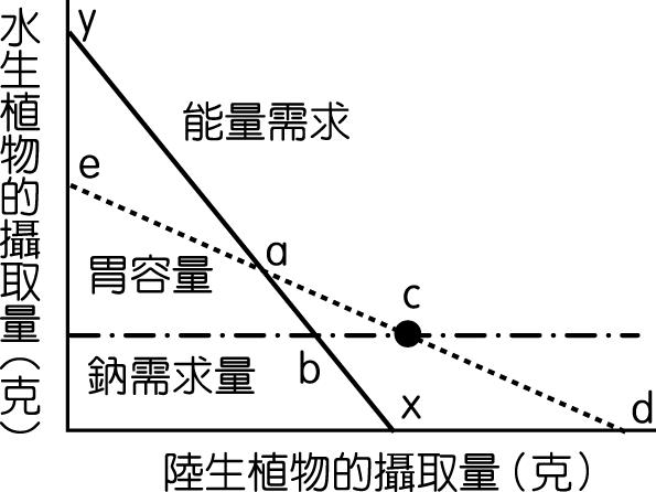 圖中顯示了麋鹿能量需求、胃容量及鈉需求量等與水生及陸生植物攝取量的關係。下列敘述何者正確?