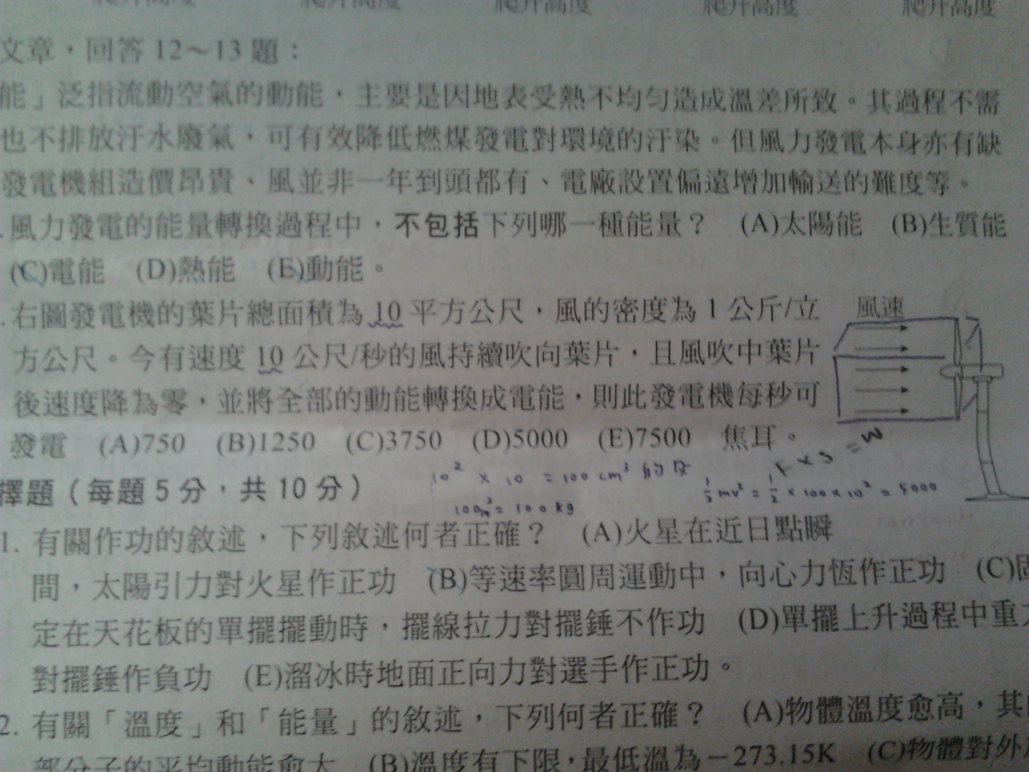 右圖發電機的葉片總面積是10平方公尺,風的密度是1公斤/立方公尺。今有速度10公尺/秒的風持續吹向葉片,且風吹中葉片後速度降為零,並將全部動能轉換成電能,則此發電機每秒可發電多少焦耳?