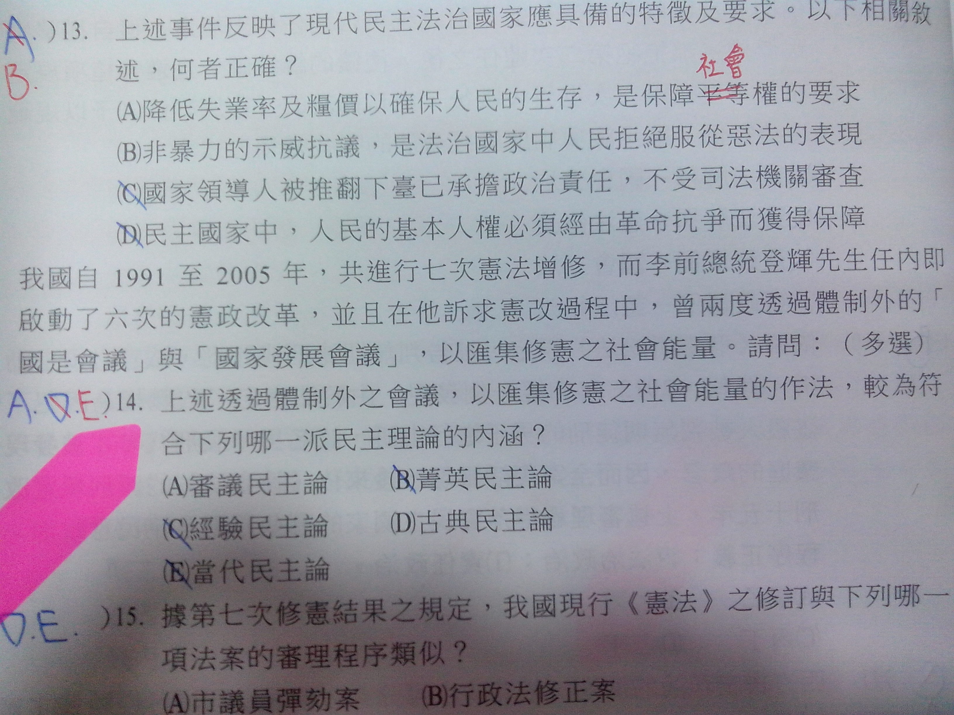 第14題。另外,什麼是當代民主論?可以解釋一下嗎!