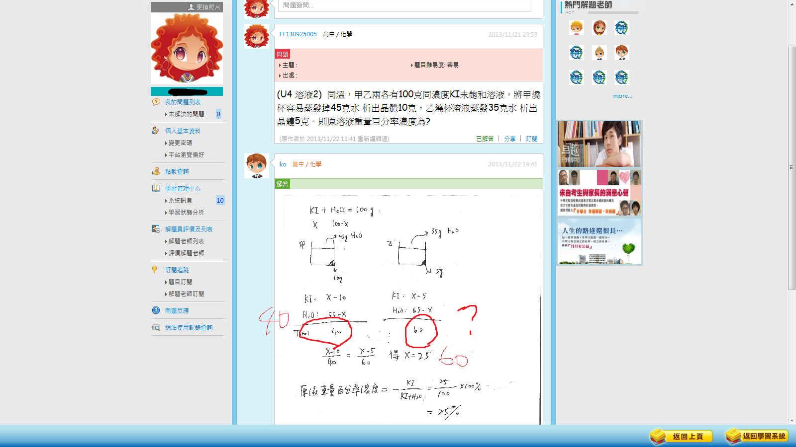 老師解釋: 圈起來部分代表 :蒸發且去掉析出晶體之後的溶液總重 而兩者都是飽和溶液 這樣可以進一步由飽和溶液濃度一樣來列式推出 X = ? 不過,那個圈出來的算式 怎麼算也算不出40 和60啊!