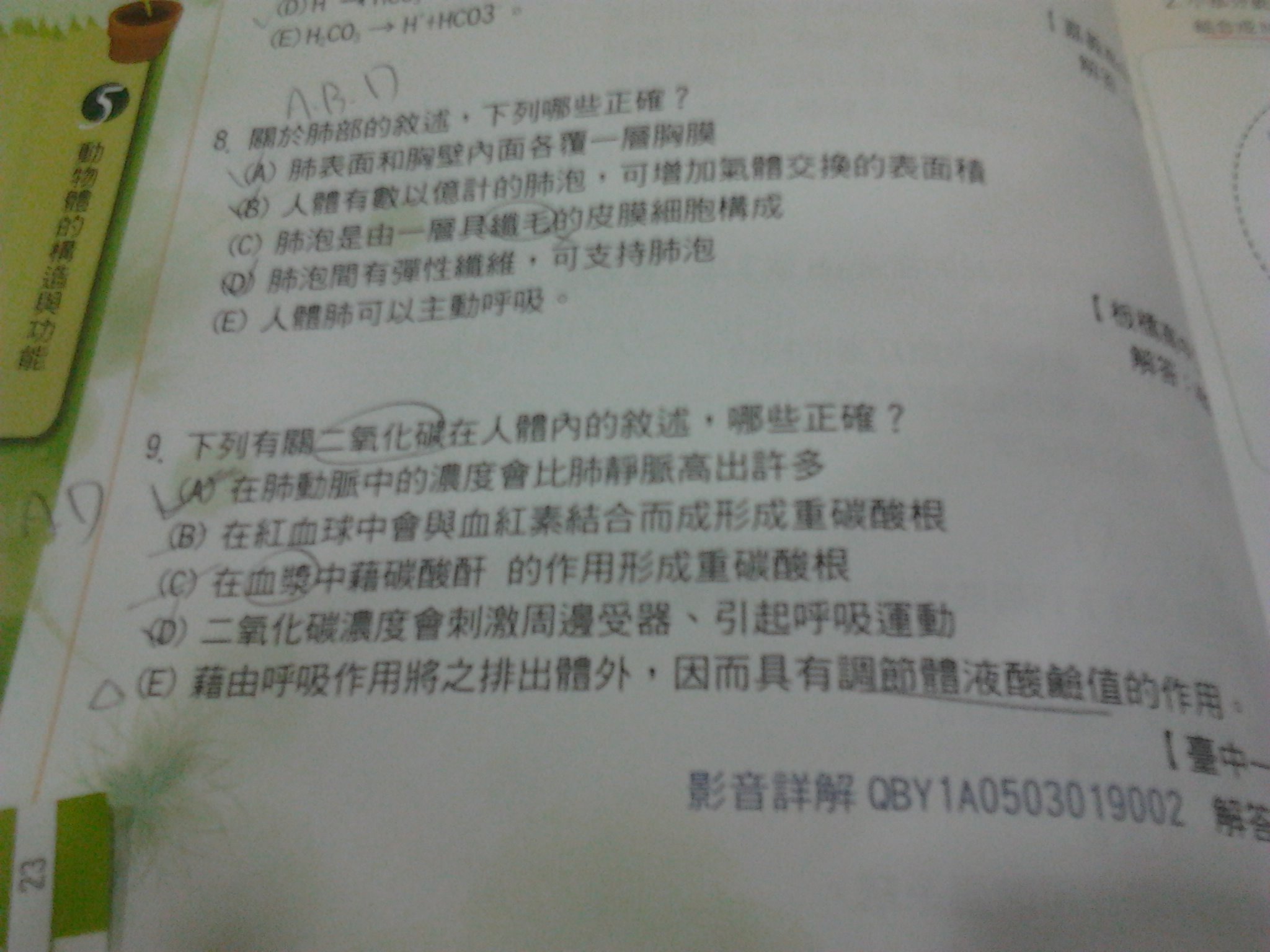 第九題B選項如何改?是二氧化碳和水結合藉由碳酸杆酶形成碳酸氫再解離成氫離子和碳酸氫根?