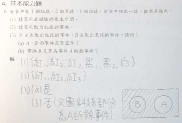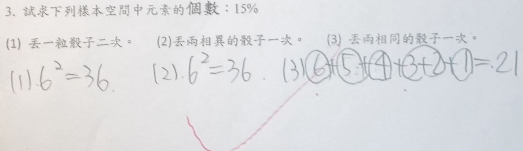 以下為學校數學習作的一題(上)與數學考卷中的一題(下): 上列題目中習作題(1)答案不為{紅,黑,白};習作題(2)答案不為{紅};考卷題(3)答案不為62=36。請問當題目問「樣本空間」時(非問機率),如何判斷是否要將「相同看成不同」?