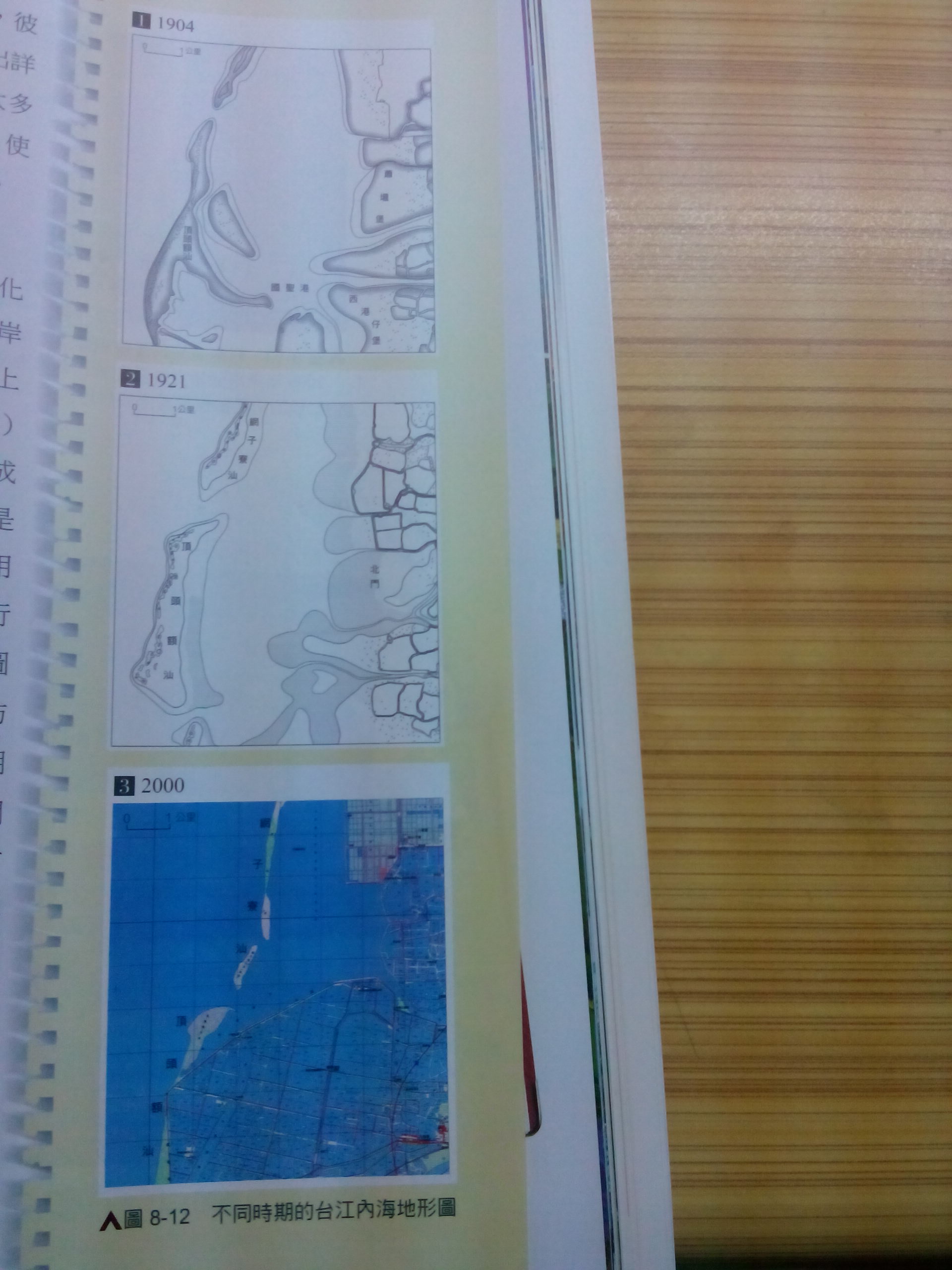 請問1904、1921、2000年這三者,台灣西南沿海的海岸線變遷為何?答案是向西移動,為什麼?我看不出來。我的感覺是不斷的縮小。