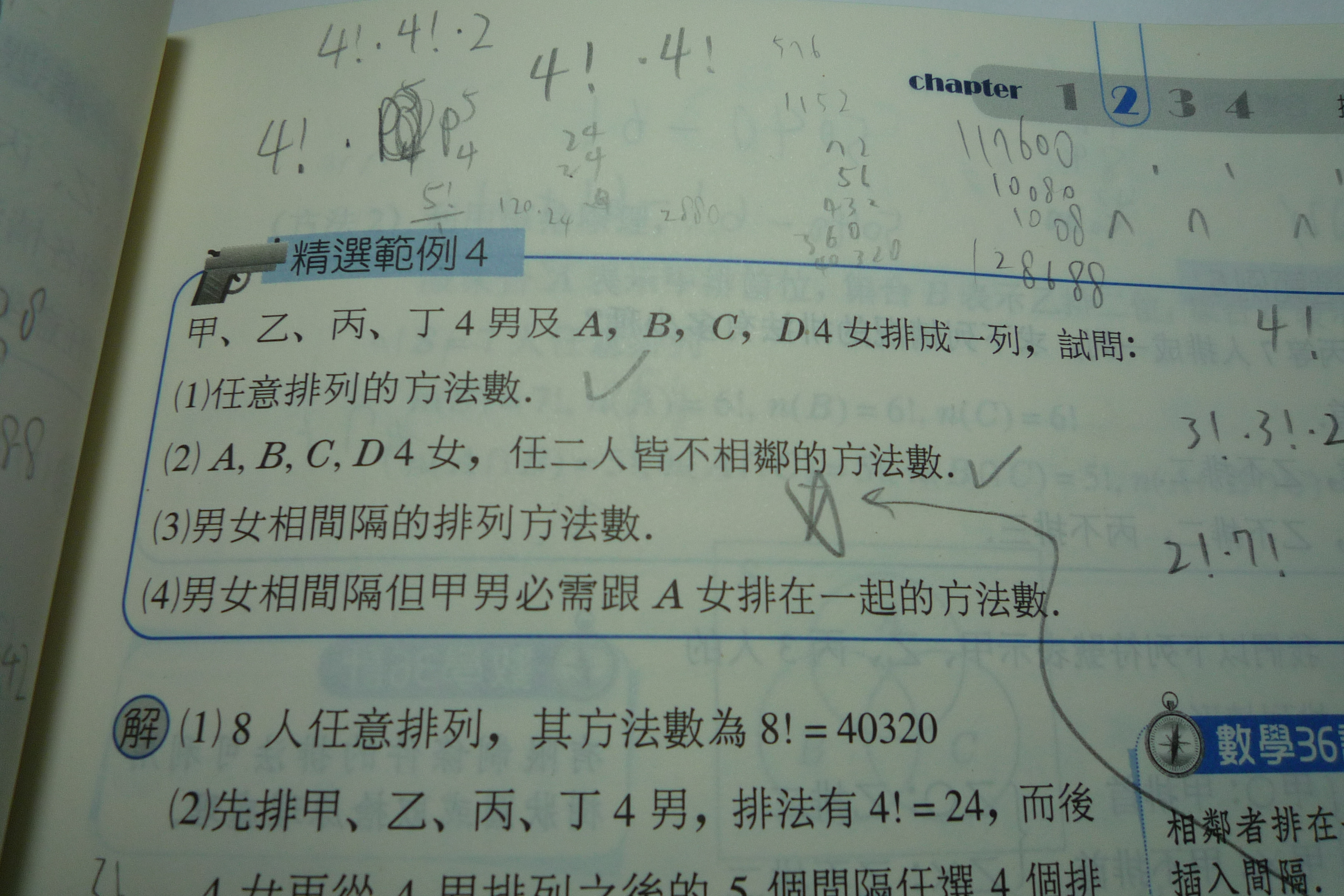 答案寫4!x2x3!,請問為甚麼不能是3 x3!x3!x2?我的想法是:先把甲男和A女排除,剩下三男排列,故3!,三女排列,故3!,而甲男和A女先不排列,他們共有三個可插入的地方─三對男女之間。最後因為男女可以對調,所以x2,請問這樣哪裡不對?