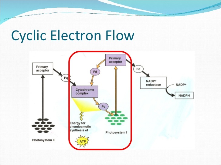 而這兩個路徑的巧妙之處,就在於Fd(含鐵蛋白),可以把電子傳給NADP+ reductase或是傳回PS1,至於是要傳給誰,純粹只看它剛好碰到誰而已。